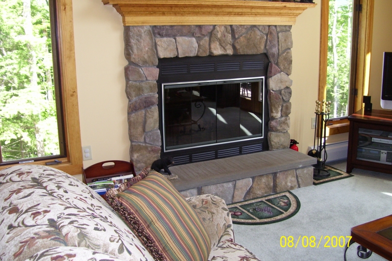 Wood Burning Heat N Glo Fireplace With A Blue Stone Hearth And Field Stone Surround